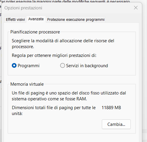 - Si aprirà la finestra Opzioni prestazioni. Fai clic sulla scheda Avanzate e sul pulsante Cambia nella sezione Memoria virtuale.